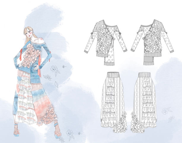 "LA PROMENADE" IS A KNITWEAR COLLECTION INSPIRED BY A FRENCH ARTIST, RAOUL DUFY. HE IS KNOWN FOR HIS COLORFUL, AIRY WASHES OF LIGHT AND SHADE WITH BOLD CALLIGRAPHIC BRUSHSTROKES, PORTRAYING LEISURE ACTIVITIES AND URBAN LANDSCAPES. ALL OF THESE ELEMENTS PLAY A SIGNIFICANT ROLE TO CREATE AN IMMEDIATE VISUAL IMPRESSION. THROUGH MY PIECES, I WANT TO CAPTURE THE ESSENCE OF UPLIFTING, MOOD-ENHANCING TONES WITH BILLOWING, VOLUMINOUS SILHOUETTES PAIRED WITH SLIMMER AND LONGER CUT STYLES, GIVING A MORE CASUAL, SOPHISTICATED UNDERTONE, WHILE CREATING A DREAM-LIKE GLIMPSE INTO DUFY'S SPRING FANTASY WITH OVERFLOWING FLOWER CROCHETS.